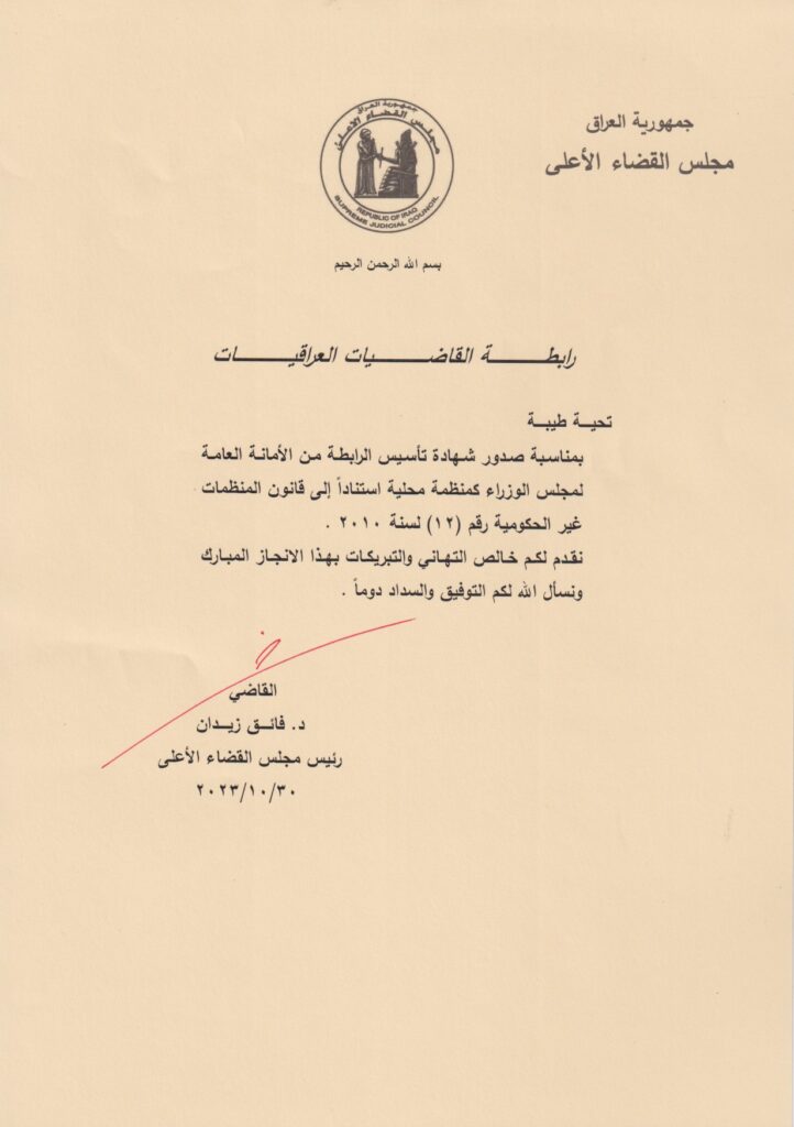 بمناسبة اليوم العالمي للقاضيات رابطة القاضيات العراقية تجدد التزامها بدعم مسيرة القاضيات وتعزيز حضورهن